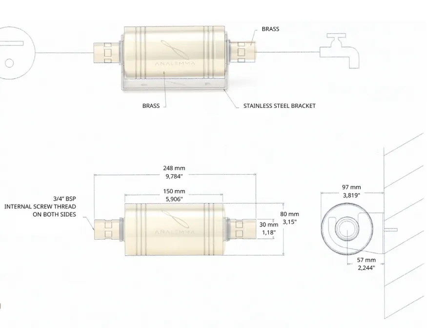 The Whole-House Analemma unit connects seamlessly into standard residential and commercial plumbing systems using industry-approved fittings. Depending on your existing pipework, appropriate connectors or adapters may be required — these are identified and managed as part of the installation process.